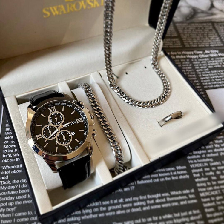 ساعت مردانه بندچرمی+نیم ست کارتیر دستبند و گردنبند + حلقه کد 84137