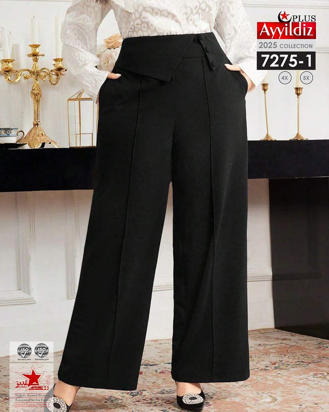 کد 7275 شلوار کلاسیک مجلسی بیگ سایز آی یلدیز دوخت و کیفیت تضمینی تنخور عالی ۴ ایکس مناسب ۴۶تا ۵۰ ۵ ایکس مناسب ۵۰ تا ۵۶ جنس کرپ جودون اعلا رنگ : مشکی ارسال فوری