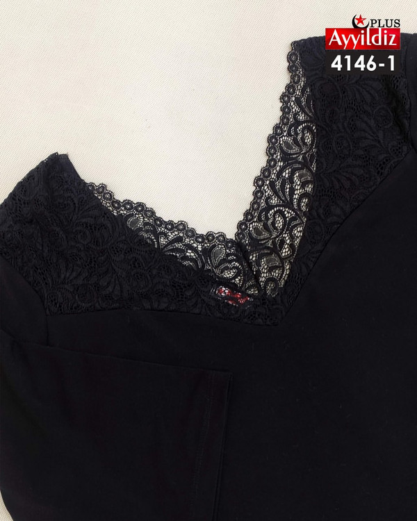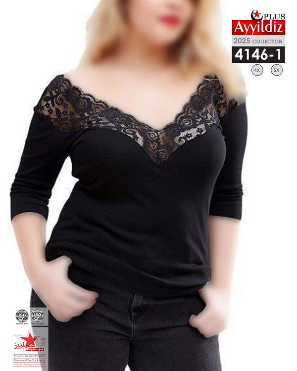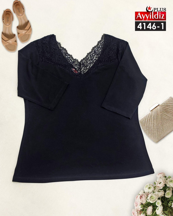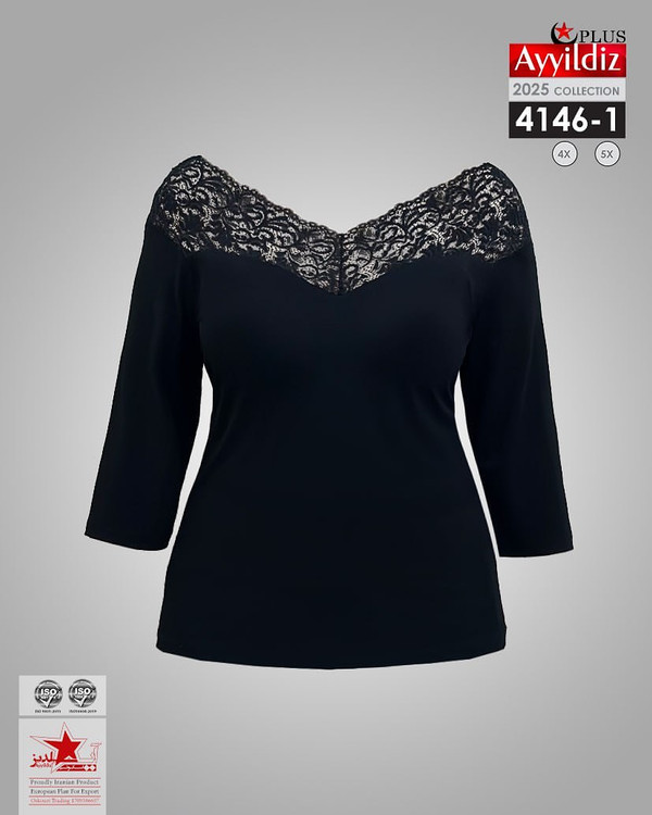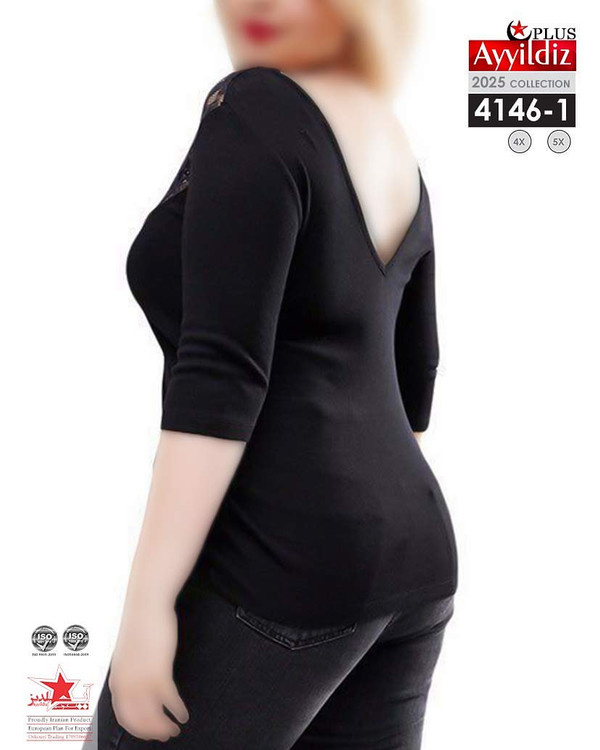 کد 4146 بلوز سایز بزرگ آییلدیز دوخت و کیفیت تضمینی تنخور عالی سایز 4مناسب ۴۴ تا ۴۸ سایز 5 مناسب ۵۰ تا ۵۶ جنس جودون و گیپور اعلا رنگ مشکی ارسال فوری