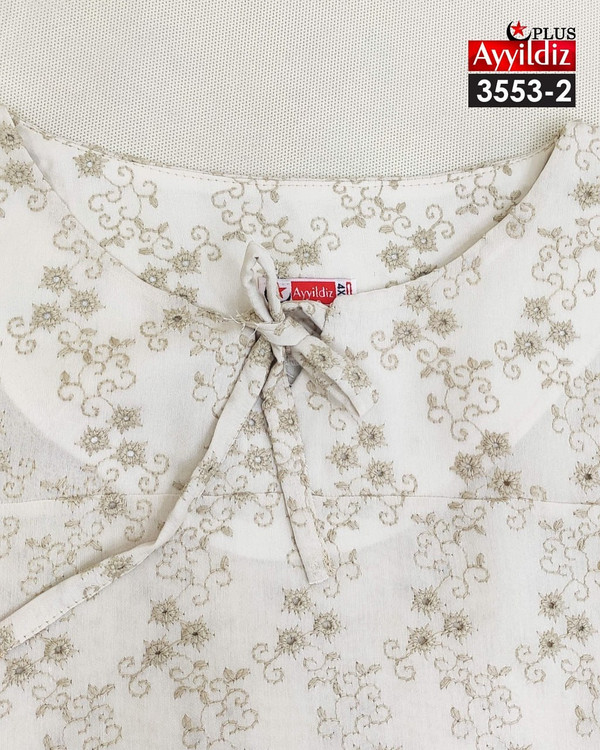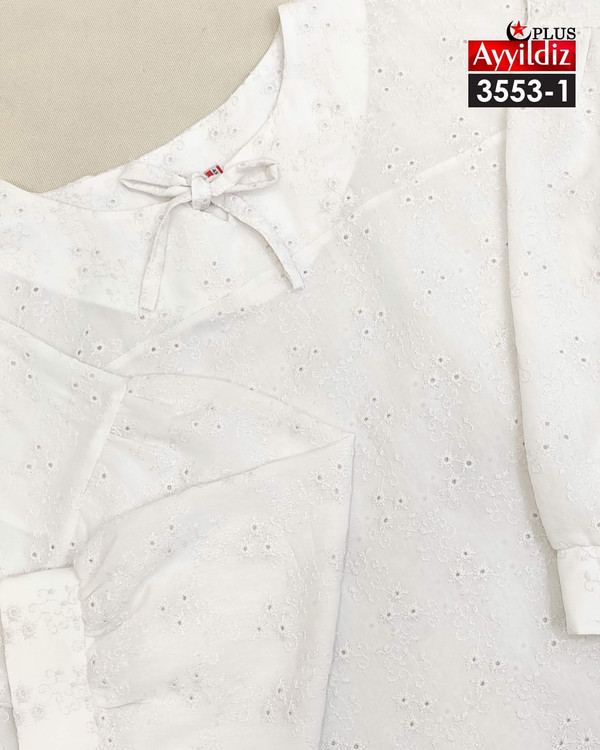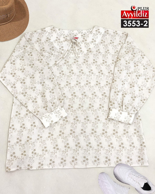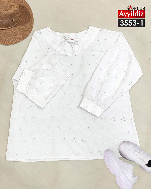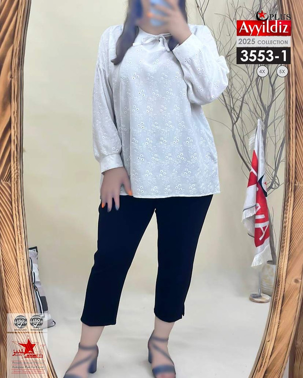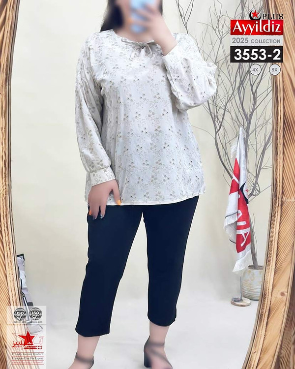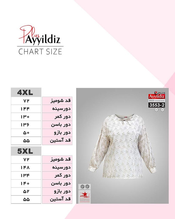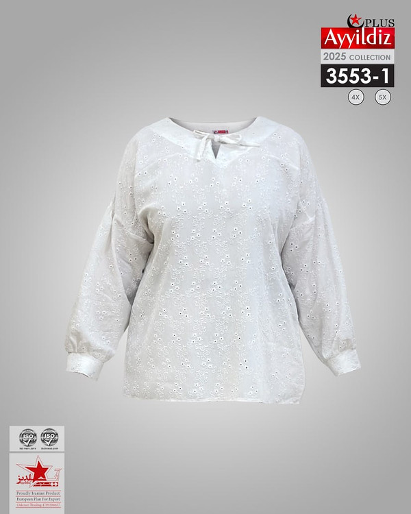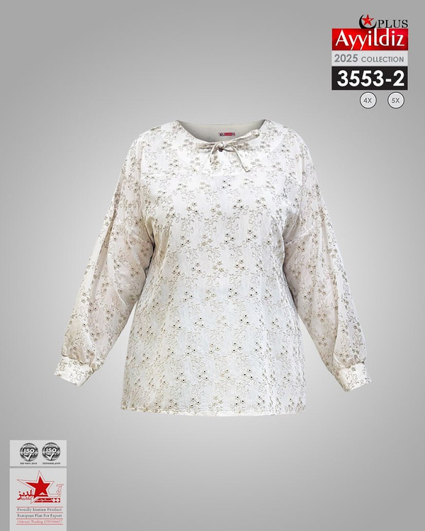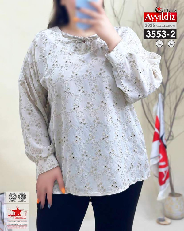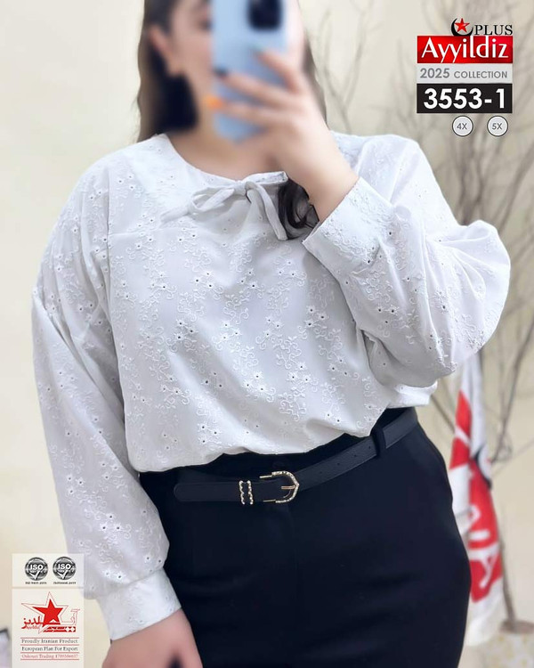کد 3553 شومیز مجلسی بیگ سایز آییلدیز دوخت و کیفیت تضمینی تنخور عالی سایز 4 مناسب 44 تا 48 سایز 5 مناسب 50 تا 56 جنس خامه دوزی خنک اعلا رنگ : سفید ارسال فوری