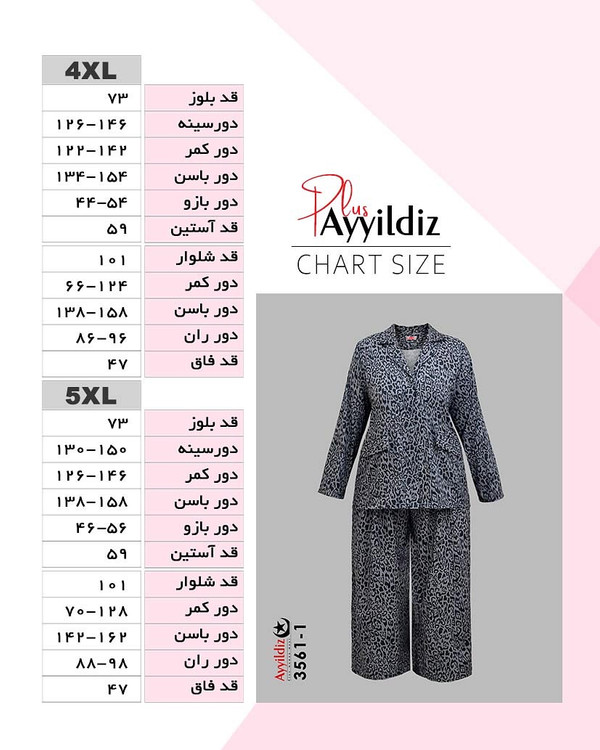 کد 3561 ست کت شلوار ساتن بیگ سایز آییلدیز دوخت و کیفیت تضمینی تنخور عالی ۴ ایکس مناسب ۴۴ تا ۵۰ ۵ ایکس مناسب ۵۲ تا ۵۸ جنس میکرو ساتن وارداتی اعلا رنگ : تصویر کاتالوگ ارسال فوری
