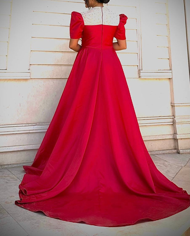 جنس : ساتن امریکایی-- نگین پانچی-- دنباله دار--پشت کار زیپ دارد-- کاپ اسفنج پیش کار