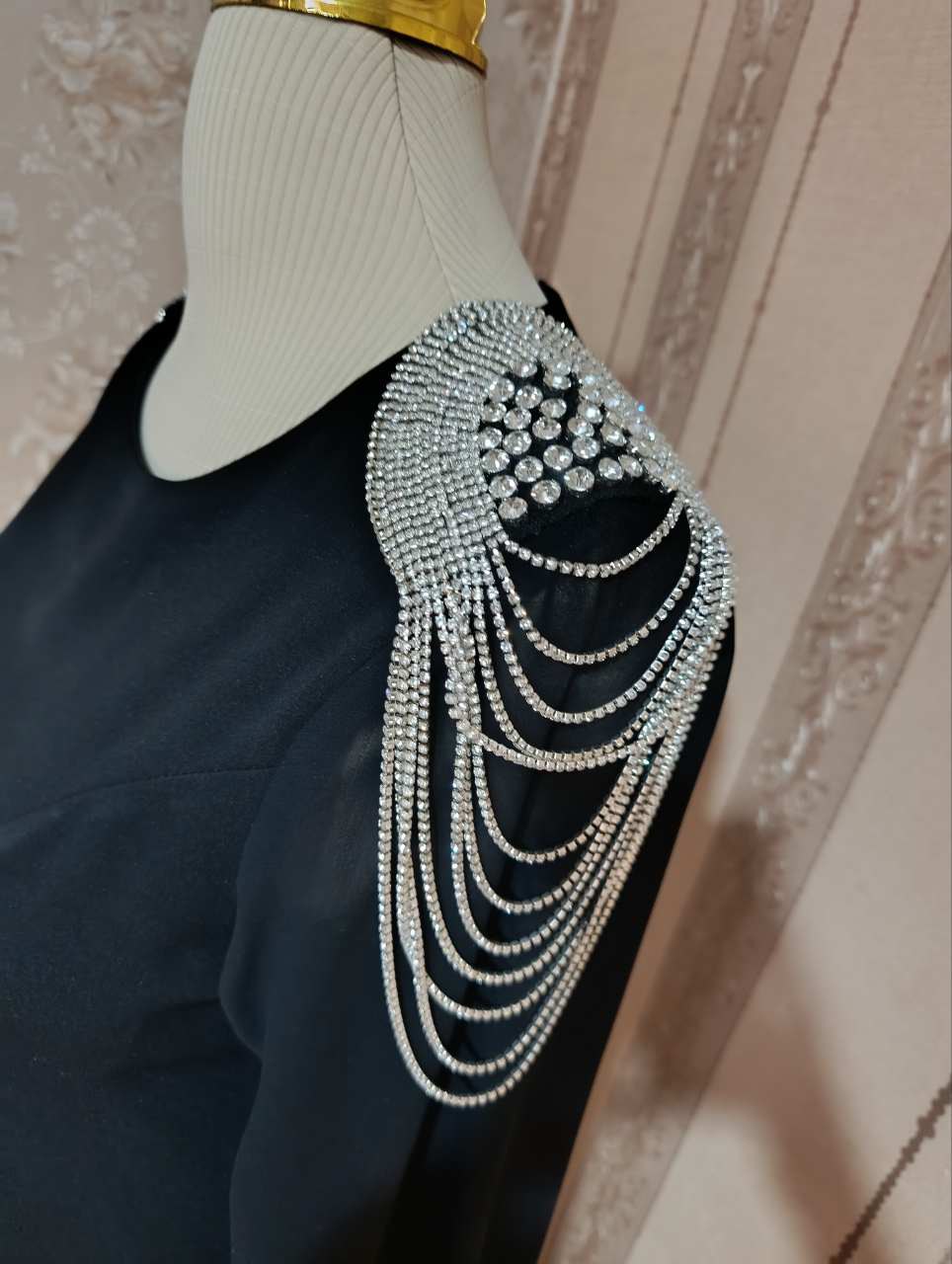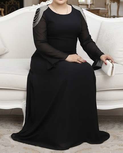 جنس : کرپ درجه یک به همراه سنگ دوزی و زنجیر-- آستین حریر-- قد حدودا ١۵٠-- کاپ سینه دارد-- پایین کار نوار دوبی کارشده