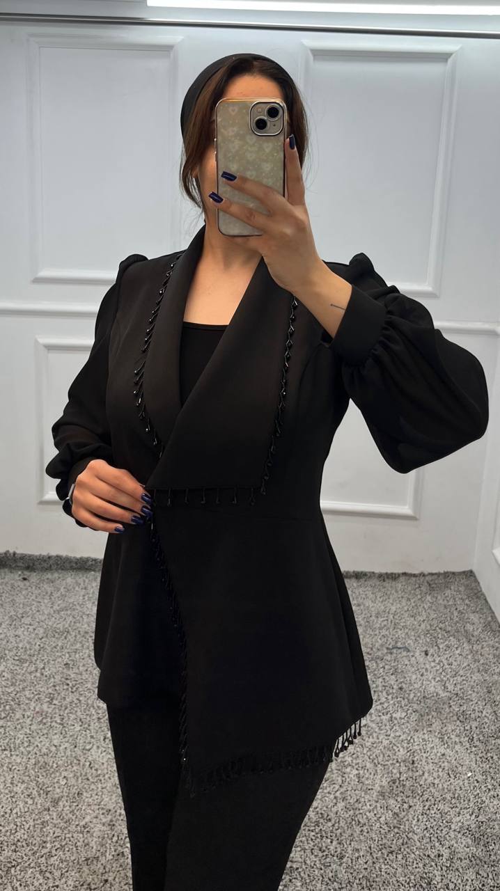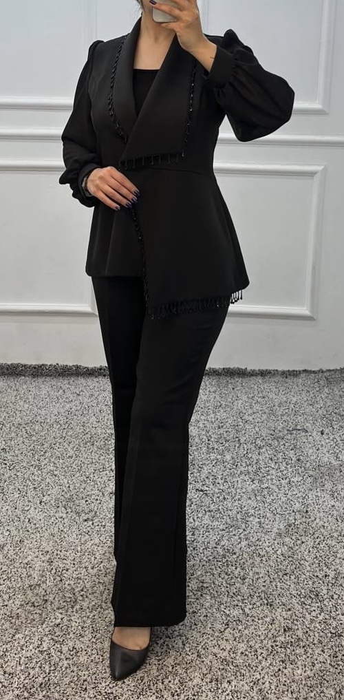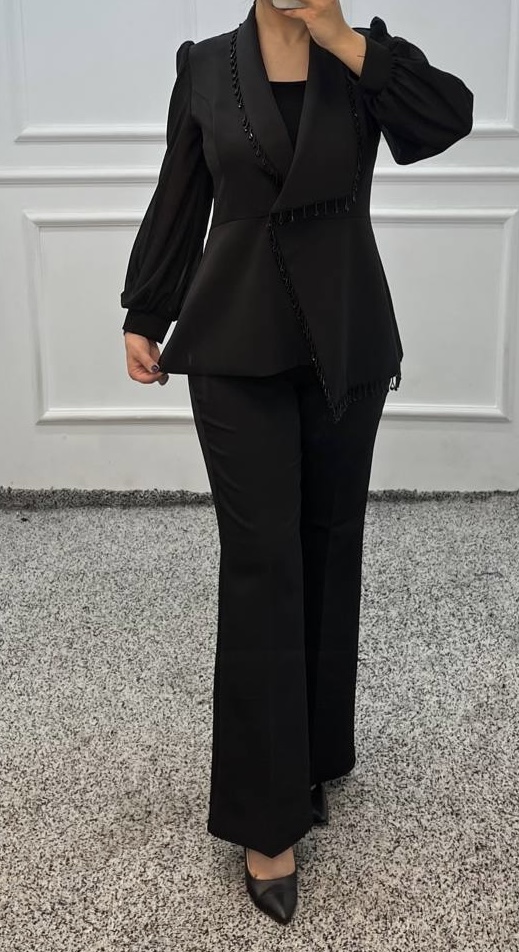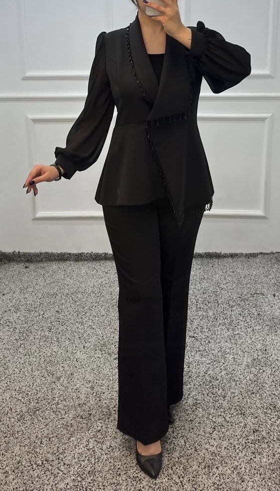 مازراتی درجه یک — آستین حریر — زیر آستین رنگ سفید تور دارد— خرج کار نوار ریسه ای و منجوق و کریستال و ملیله— قد کت۷۰– قد شلوار۱۰۵–شلوار زیپ از بغل دارد