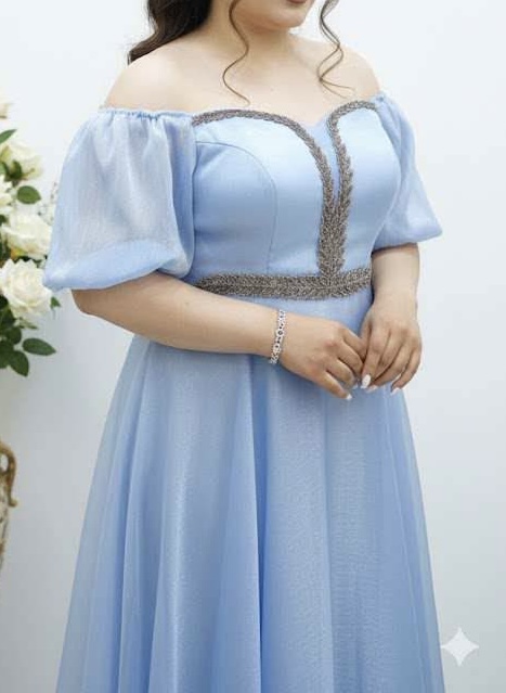 تور ارگانزا تمام آسترکشی شده، جلومان سنگدوزی شده،— قد کار از بند سرشانه ۱۵۵– پایین کار نوار دوبی کار شده— کاپ سینه دارد
